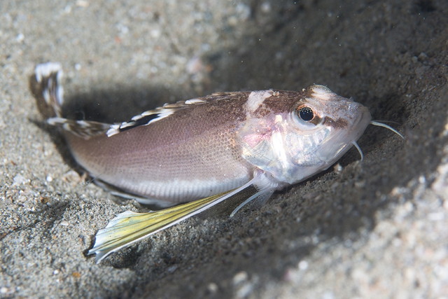 肉食魚のため夜は獲物となる小型の甲殻類や魚類を探しますが、見つけると大きな胸びれ相手を追い込んだり、大きなひげで砂の中の獲物を探すような行動をとります。