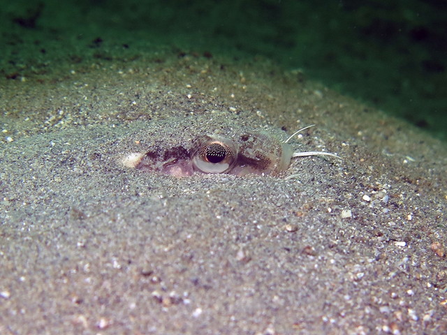 夜行性で昼は砂の中に体を埋めて眼だけを出すようにして身を隠していますが、驚くと胸びれを大きく広げて相手を威嚇する行動をとります。