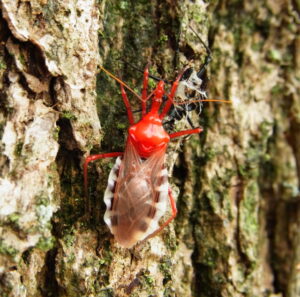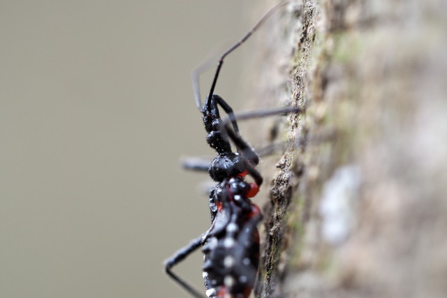 ヨコヅナサシガメは普段は目の届きにくい樹上にいるため、小さい子が見つけるとユニークな見た目から興味を引くかもしれませんが、絶対に素手で触ったり、捕まえたりしないようにしましょう。防御行動のため非常に鋭い口吻は簡単に手に刺さり激痛を与えます。